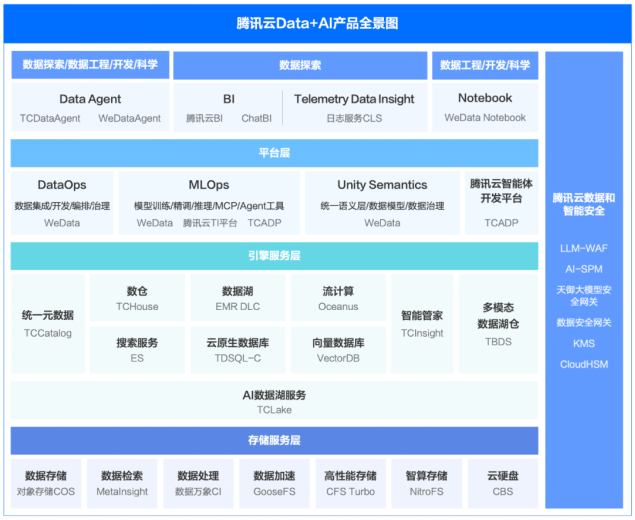 腾讯云致力于通过Data+AI技术深度融合,为企业构建高效智能的企业级基础设施。其Data+AI能力以数据管理为核心,整合AI算力、数据存储分析、数据治理、安全管理及AI模型训练与实时决策等产品服务,提供从数据接入到智能应用的端到端解决方案。