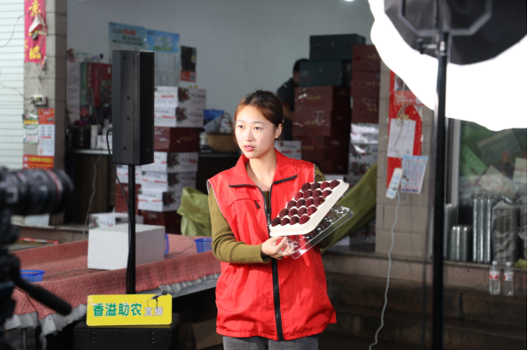 (图为志愿者通过线上展示采摘的杨梅)