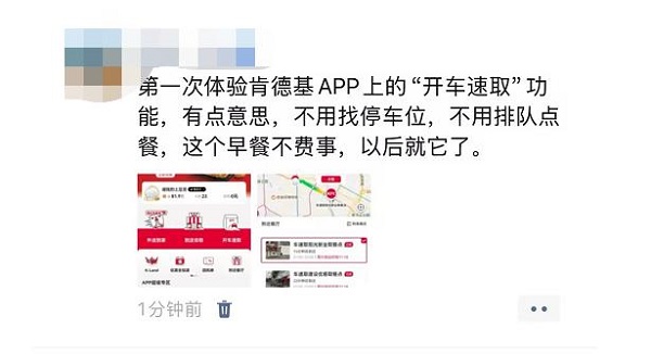 “第一次体验肯德基APP上的‘开车速取’功能,有点意思,不用找停车位,不用排队点餐,这个早餐不费事,以后就它了。”成都白领小张在体验肯德基APP最新上线的“开车速取”服务后忍不住分享了朋友圈。据了解,小张是肯德基的忠实粉丝,但是每天早上开车上班,虽然会路过肯德基,却从来没有吃过它的早餐,因为需要停车进店点,这个时间对于‘争分夺秒’的清晨太奢侈了。现在肯德基APP上线“开车速取”服务,让他也可以在早高峰实现肯德基“早餐自由”,“还可以多睡五分钟”。