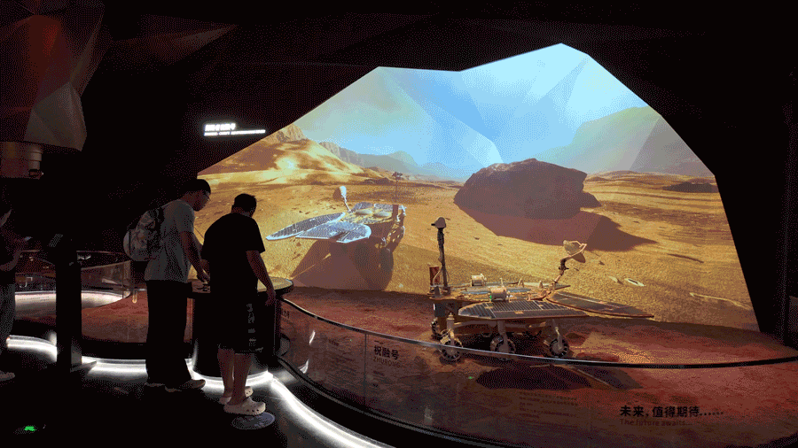 在异形幕布上呈现火星场景画面,搭配按钮、旋钮、互动屏等外设,让观众操作“祝融号”执行任务,还能观测火星光谱成像、浏览多光谱相机画面,沉浸式解锁太空知识。