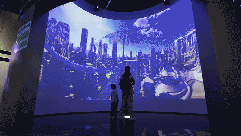 投影在此打造了一个环绕式、沉浸式的视觉空间。通过观众投票选择剧情节点,呈现火星基地虚拟探险、月球基地研学、未来城市风光等场景画面,让观众沉浸式体验智慧生活。