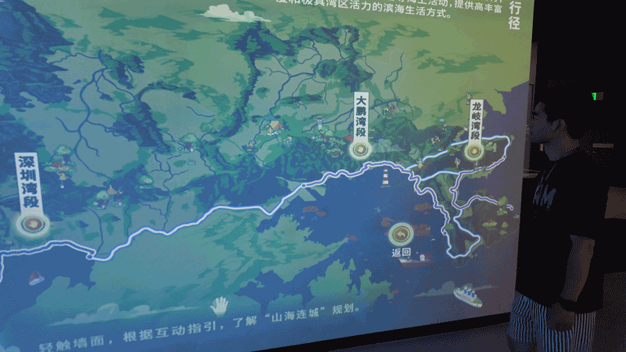 展项组由雷达互动投影墙组成,呈现深圳市山海连城计划的总体布局大图景。轻触墙面,即可根据互动指引,了解“山海连城”规划。