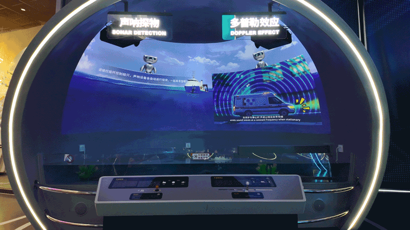 观众操作摇杆控制船只、按下按钮启动声呐,投影系统即可响应交互指令,动态呈现声呐探物场景,将“搜寻沉船或飞机残骸”的海洋科技体验,通过互动投影技术直观、趣味化呈现。