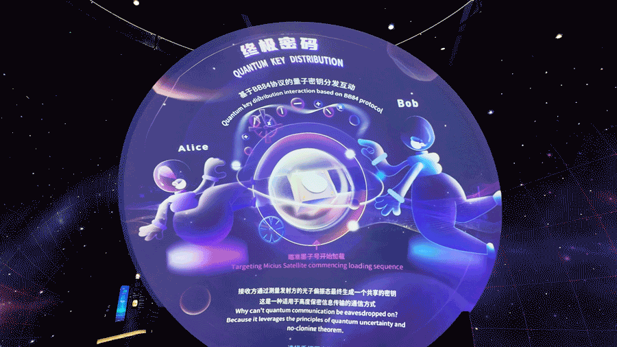 借助投影技术,将互动界面投射到内凹圆形幕布内,观众依据画面提示,选择“发送方”或“接收方”操作位在限定时间内协同完成密钥分发任务,借光影交互让抽象量子通信安全原理,转化为可操作、可感知的体验。