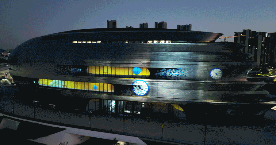 傍晚,建筑外立面突然变成流动的星河,28台光峰激光工程投影机投射其表面,凭借其高流明、画面清晰、精准色彩还原等特性,让画面不被周围光线干扰,细节精准贴合建筑曲面,光影随建筑轮廓流淌,为市民打造科技感十足的户外3D Mapping光影秀,沉浸式解锁建筑与光影融合的奇妙体验。人群中不断响起 "哇" 的惊叹声,有个小女孩指着墙面喊:"爸爸你看,时空隧道!"