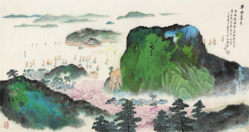 华拓先生是当代中国画坛极具声望的山水画大家,尤其在传统青绿山水领域取得了突破性成就,为“新金陵画派”的核心代表。作为与钱松喦、亚明、宋文治、魏紫熙并称的“金陵八家”之一,他更是该画派第一代山水画大师中硕果仅存者。自上世纪80年代起,华拓先生便多次与钱松喦、亚明等前辈大师共同担纲重任,为人民大会堂、国务院紫光阁、天安门城楼等国家重要殿堂创作鸿篇巨制,其作品代表着中国山水画的崇高境界与时代精神。