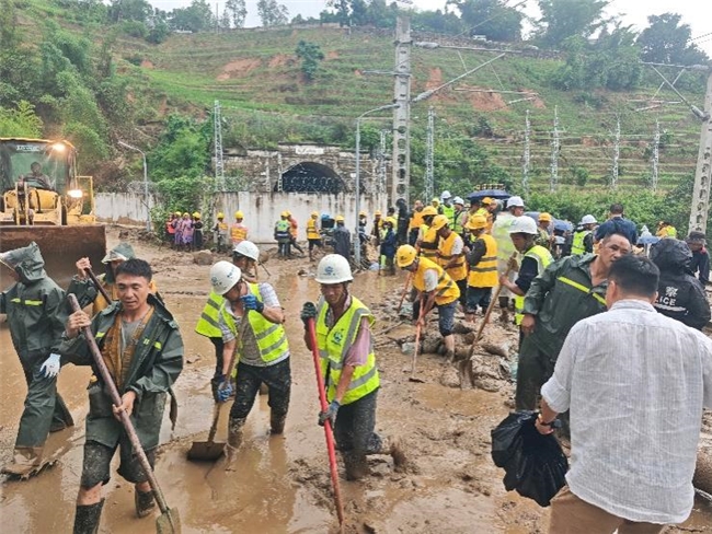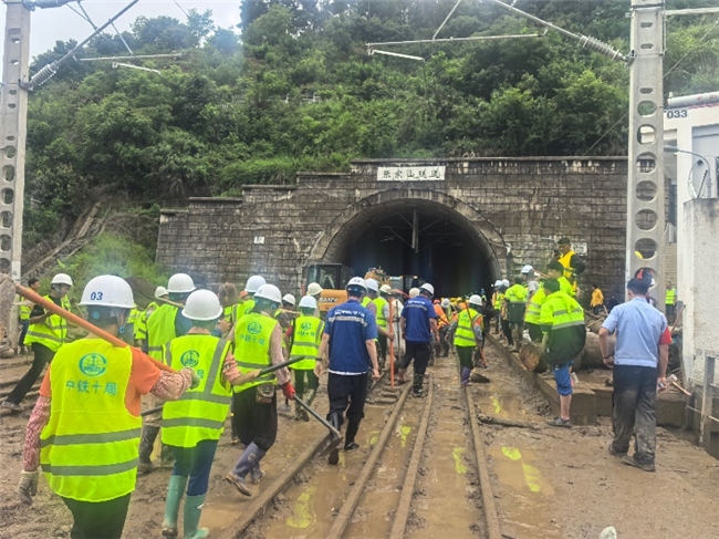 中铁十局临沧物流园项目迅速响应国铁昆明局广通工务段抢险号召,组织35名抢险人员携带抢险应急物资和工器具,在红豆山隧道出口和张家山隧道进口段展开了一场与时间赛跑的抢险救灾行动。