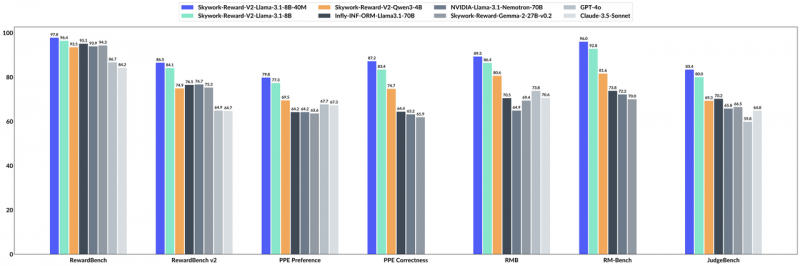 在 Reward Bench v1/v2、PPE Preference & Correctness、RMB、RM-Bench、JudgeBench 等共七个主流奖励模型评估基准上,Skywork-Reward-V2系列全面达到了当前最优(SOTA)水平。