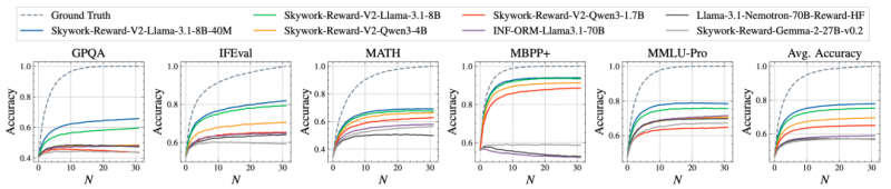 图丨Skywork-Reward-V2在PPE Correctness下五个子集的Best-of-N任务中皆达到最佳