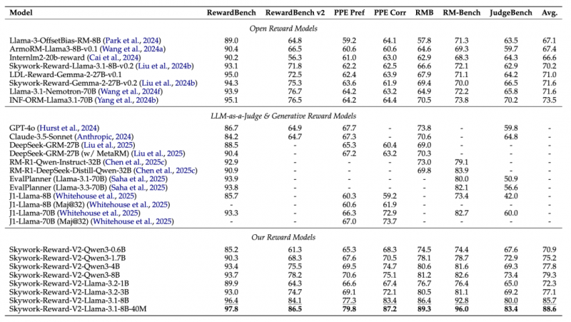 在通用偏好评估基准(如Reward Bench)上,Skywork-Reward-V2系列优于多个参数更大的模型(如70B)及最新的生成型奖励模型,进一步验证了高质量数据的重要性。