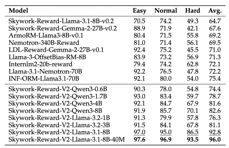 即便基于最小模型Skywork-Reward-V2-Qwen3-0.6B,其整体性能已几乎达到上一代最强模型Skywork-Reward-Gemma-2-27B-v0.2的平均水平。更进一步,Skywork-Reward-V2-Qwen3-1.7B在平均性能上已超越当前开源奖励模型的SOTA——INF-ORM-Llama3.1-70B。而最大规模的Skywork-Reward-V2-Llama-3.1-8B,在所有主流基准测试中实现了全面超越,成为当前整体表现最优的开源奖励模型。