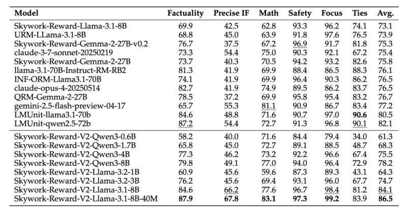 图丨Skywork-Reward-V2系列在RewardBench v2评测集上的表现