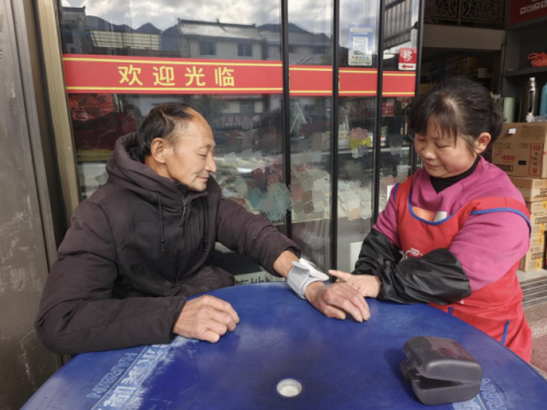 图为松阳县零售客户叶春霞(右)正为涂小南大爷量血压