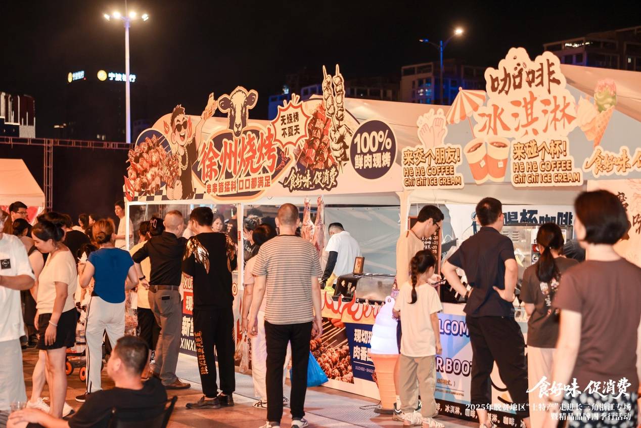 在极具人气的星光烟火区,温州小海鲜、小龙虾、特色烧烤和夏季冷饮摊位前人头攒动,夏夜的烟火气与农产品的鲜香交织,构成消费帮扶当中生动的注脚。
