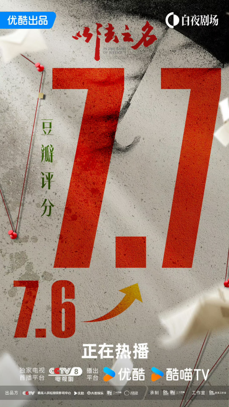 《以法之名》是国内首部聚焦“检察侦查”职能的剧集,具有题材破冰的意义,该剧自6月24日播出以来热度持续攀升,创新的题材视角、扎实的剧情设计和演员的突破性演绎,引发追剧热潮。该剧目前豆瓣评分7.7分,超过3万人进行了评分,并登上豆瓣实时热门榜第1名。