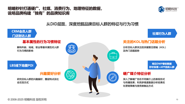 该方案的核心是打通硬广、社媒、消费行为、LBS地理特征、CRM会员等多维数据,从DID层面进行深度挖掘与匹配,为品牌构建一个动态、鲜活且「独有」的品牌人群知识库,清晰地描绘出目标人群的基础属性、兴趣偏好、关注的KOL、热门话题、消费习惯与完整的媒介触点。