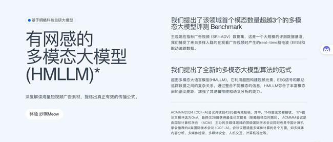 为产品保驾护航的技术底座,是明略科技业内领先的多模态大模型技术能力。据悉,明略科技研究成果——超图多模态大语言模型(HMLLM)弥合了丰富模态间的语义差距,增强了其逻辑推理和语义分析的能力,构建了全新的多模态大模型算法的范式;该成果的相关论文更是被国际顶会ACMMM 2024(CCF-A类)收录,得到专业认可。此外,明略科技还提出了该领域首个模态数量超过3个的多模态大模型评测基准(Benchmark)。