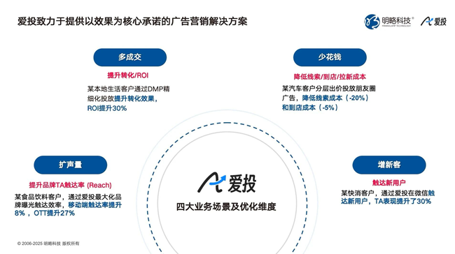 ● 独有算法:基于明略科技深厚的数据积累及独有的爱投Co-Pilot算法,实现从追踪、分析到归因的全链路打通。