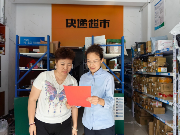 图为专卖人员(右)向快递从业者普及法律知识