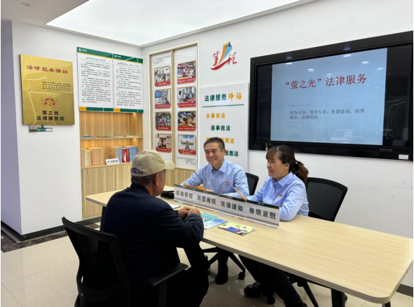图为专卖人员(左一、二)在法律服务驿站为群众提供法律咨询服务