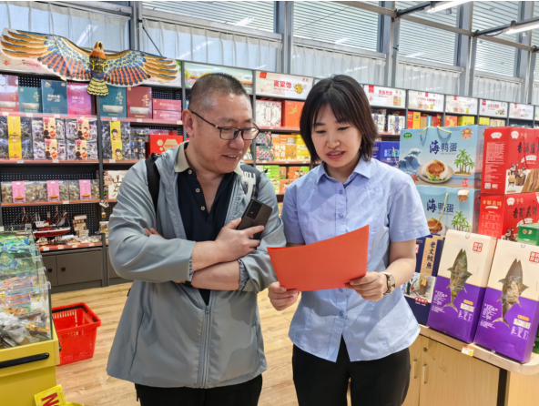 图为专卖人员(右)向零售户普及烟草专卖零售许可证延续相关知识