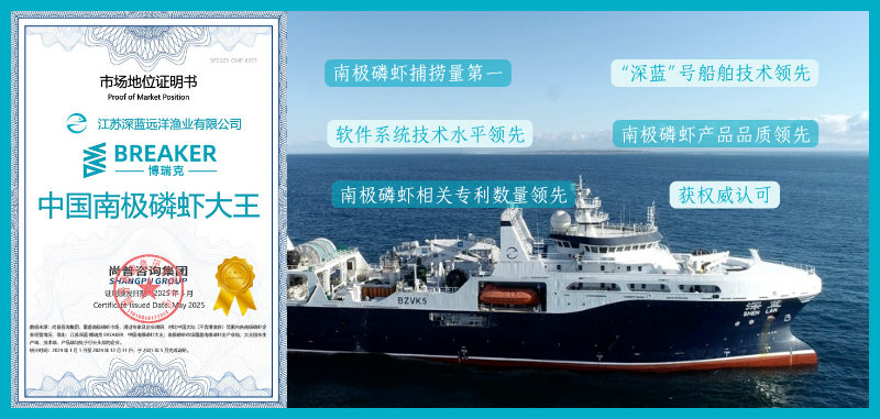深蓝BREAKER的卓越品质,不仅体现在捕捞、加工和运输的每一个环节,更得到了专业机构的权威评定与认可。经过对捕捞端、加工技术端、品质端等全方位的严格评估,深蓝BREAKER凭借多项领先优势,荣膺“中国南极磷虾大王” **称号。