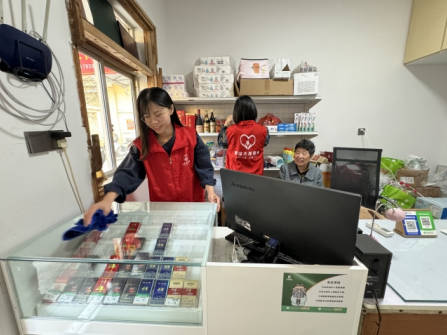 (图为常山烟草志愿者帮助老年零售户整理商品陈列)