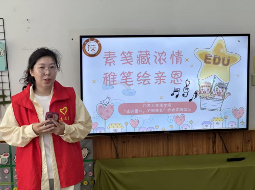 为弘扬中华民族孝亲敬老传统美德,深化儿童感恩教育,6月17日,江苏大学法学院“法润童心,护航成长”实践团队走进镇江市谷阳路新村小朋友园,开展“素笺藏浓情,稚笔绘亲恩”父亲节主题绘画活动。活动以艺术创作与情感教育相结合的形式,引导小朋友通过画笔表达对父亲的感恩之情,展现新时代青年学子服务社会、关爱儿童的责任担当。