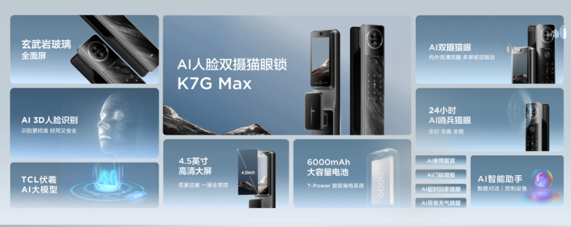 不仅是创新材料的应用,技术创新也是硬实力的体现, TCL智能锁今年发布了全球首款AI大模型-伏羲AI大模型,深度融合AI给到用户最极致的刷脸入户体验。凭借领先的AI技术,TCL AI人脸双摄猫眼锁K7G Max夺得“AI模型交互金奖”,这款产品搭载AI 3D人脸识别和AI双摄分布式猫眼。新一代AI 3D人脸识别,搭载8大AI自进化算法,使一次识别通过率提升1倍,即使在黑暗逆光或妆容变化的情况下,都能出色表现,大大提升了人脸解锁体验。AI双摄猫眼,搭载了内外双高清摄像头,家里家外状况都能看得见,全面升级AI系统,能够AI智能分析访客身份,AI生成访客视频,节省用户回看时间。还有 AI亲情管家、AI智能助手、AI门锁简报、AI超时回家提醒功能,让智能锁更懂用户。