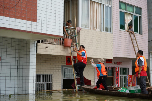 (图为郁南烟草党员志愿者送物资到被困村民家中)