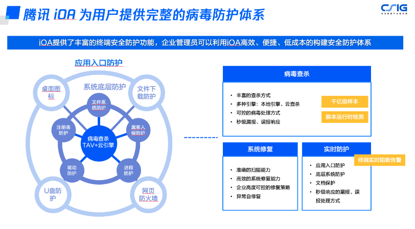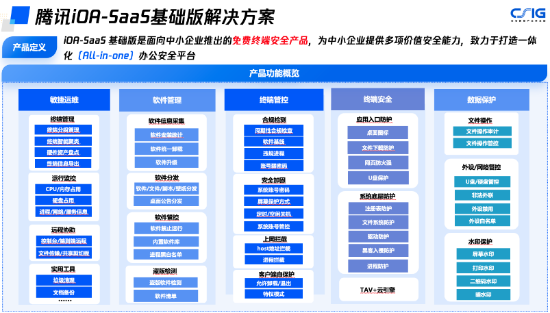 腾讯 iOA 自 2020 年上市以来,已经持续迭代 6 年,目前腾讯 iOA 已经集成了零信任接入、终端杀毒、终端管控、终端防泄密DLP 、终端检测与响应、软件管家、远程协助等多重能力,实现了 All in one 产品设计和一体化安全管控。