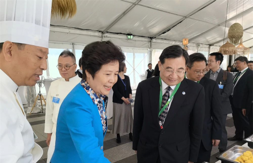 杨柳会长和王海东大师向胡和平副部长介绍招待会菜品