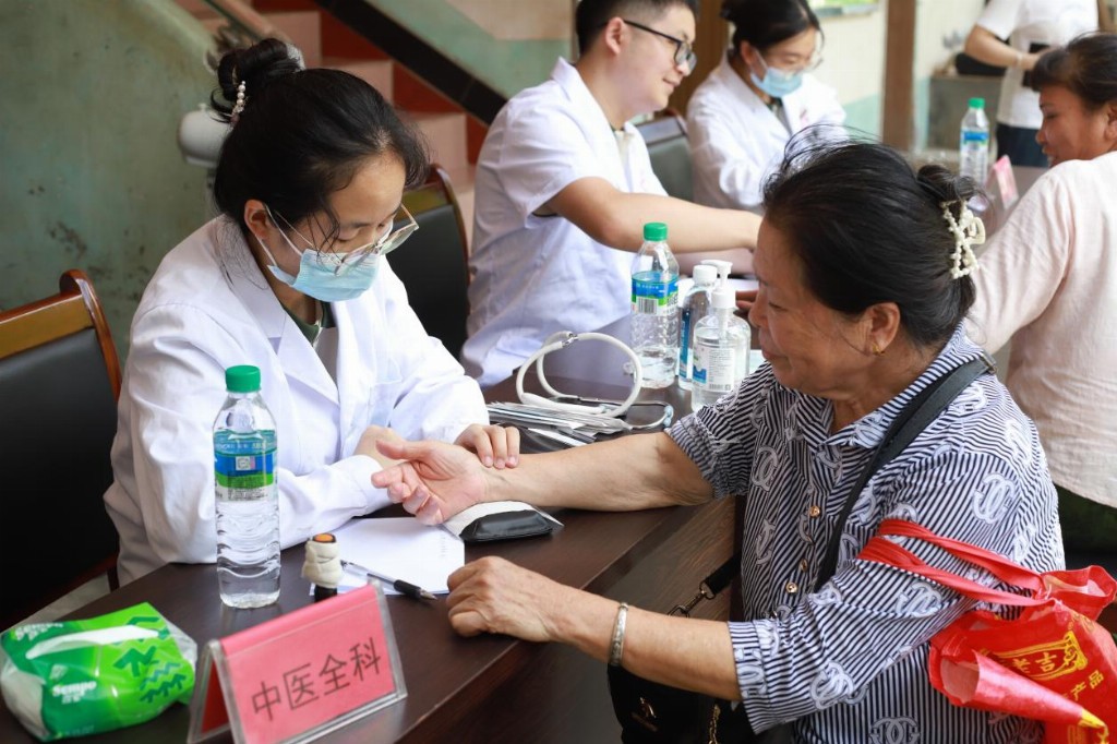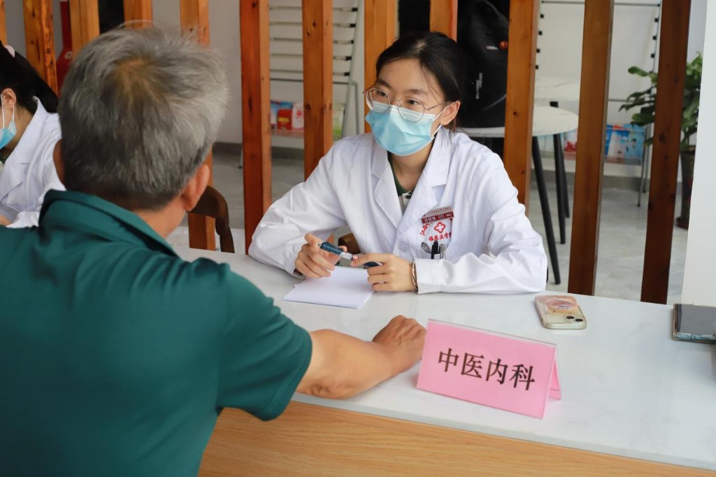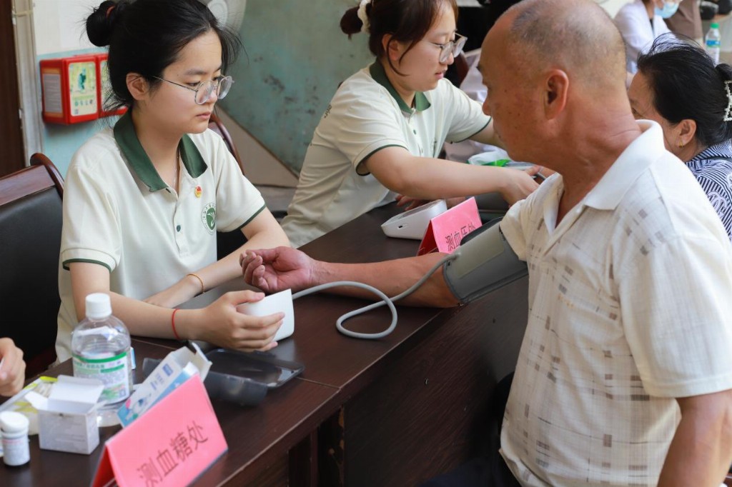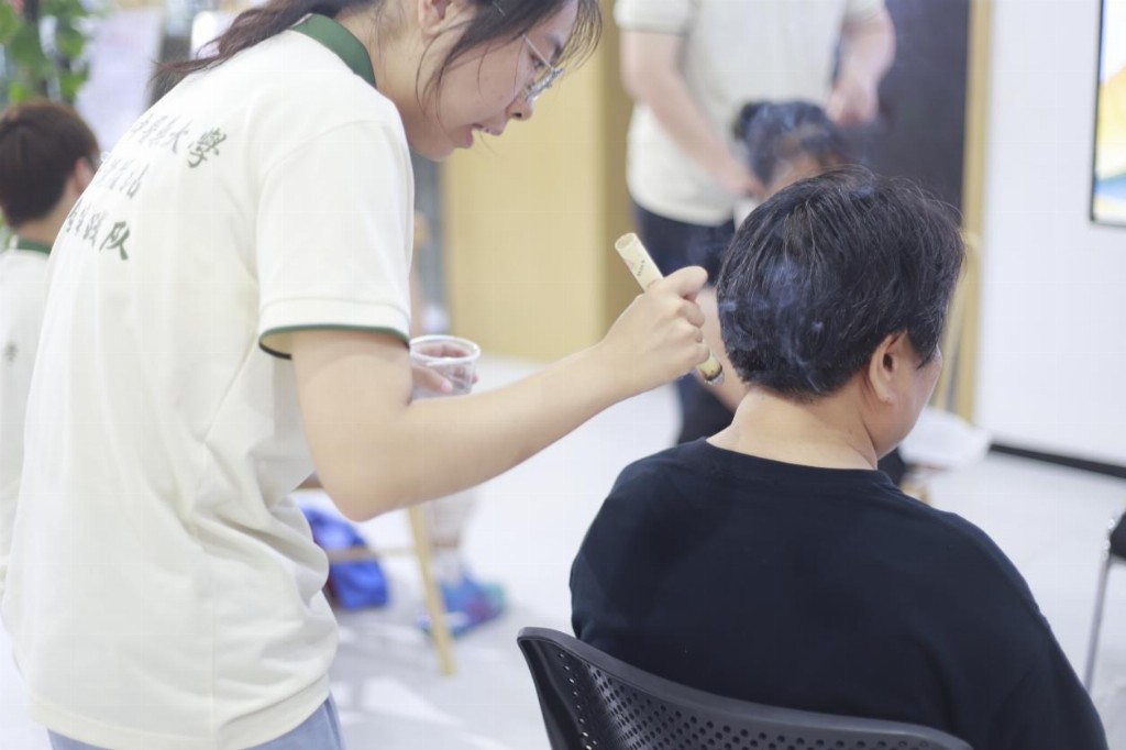 清晨的阳光洒在义诊现场,热闹非凡。义诊区的诊台前,研究生指尖搭住八旬老人浮起的脉管:“您这弦脉得用逍遥散加减。”推拿组队员手握虚拳,掌骨着地,前臂一送一收,患者连称“肩背松快多了”;艾灸区弥漫艾草焦香,队员捻动艾条为肩周炎患者驱寒:“热感顺着膀胱经走才算到位。”基础组成员则忙碌于测量血糖、血压等常规检查,确保每位村民都能获得科学的健康评估。