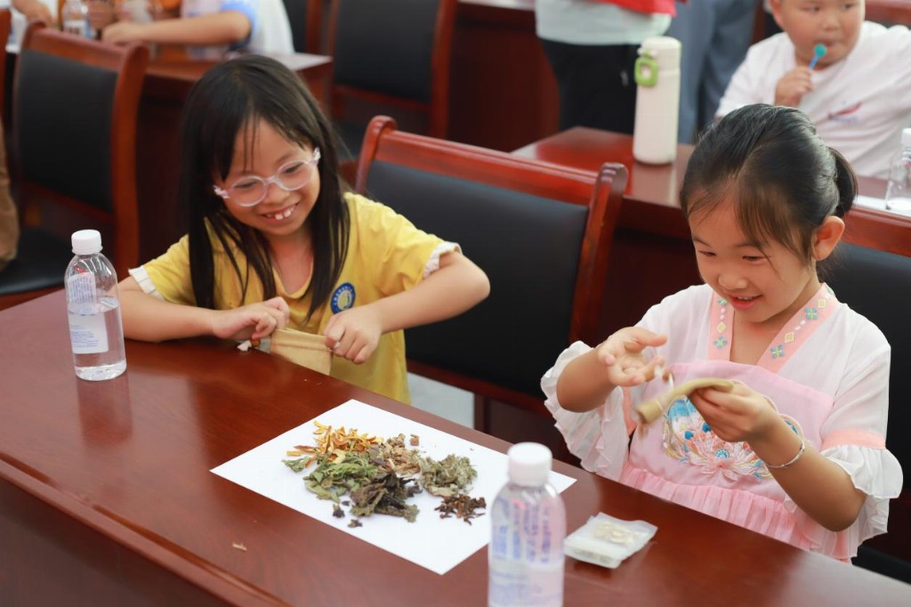 最令人眼前一亮的是中药材手工制作活动。在队员的指导下,孩子们亲手制作了中药材发夹、香包等小物件。一枚枚小巧精致的手工品,承载着传统文化的温度,也激发了孩子们对中医药的好奇与热爱。最后,实践队组织开展了传统功法教学活动,学习八段锦等中医养生操,将养生意识延伸至每一个角落。