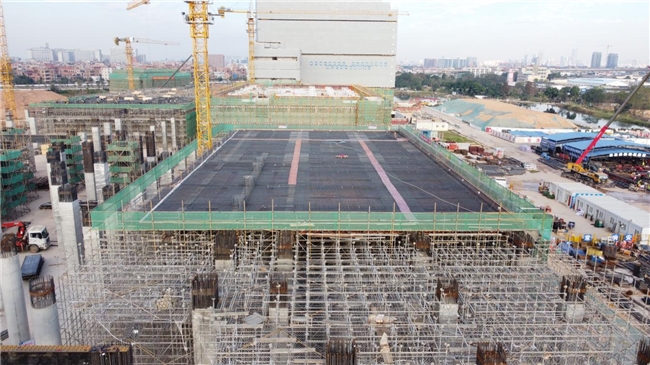 道滘车辆段工程作为东莞轨道交通首个TID综合开发项目,物业开发平台17.13万平方米,型钢混凝土组合构件高建钢构件用量居全国车辆段前列,高达1.7万吨。项目团队坚持做好品质建造,打造精品工程。遵循“方案先行、全面策划”理念,从Tekla软件进行组合钢构件全面深化设计、应用补偿收缩混凝土、研究超大面积梁板应力释放与控制、探索优化混凝土浇筑与养护施工工艺等多方面着手综合管控,超大面积梁板成品工程做到了“零裂缝”“零渗漏”,物业开发平台抗收缩性能和抗裂性能得到显著提升。