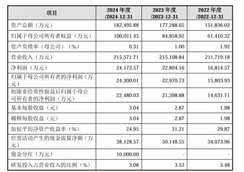 根据招股书披露,植物医生近年来业绩稳健增长。2022年至2024年,公司分别实现营业收入21.16亿元、21.50亿元和21.55亿元,归属于母公司净利润从1.68亿元增至2.42亿元。公司核心收入来源于水乳膏霜,2022年至2024年占整体收入比例分别为53.96%、54.33%、56.52%。