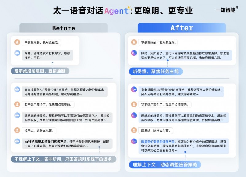 为此,一知智能此次推出的「太一语音对话Agent」,深度解决用户场景适配性痛点。相较于豆包、DeepSeek等通用大模型,太一更聚焦语音交互深度与垂直业务场景理解,输出的内容高可控与强合规;相较于规则型AI外呼, 太一又具备复杂语境理解力与动态思考能力,对话更流畅自然。可以这么理解,「太一语音对话Agent」更像是一个听得懂、会思考、有温度且“业务能力强”的「高情商营销专家」。