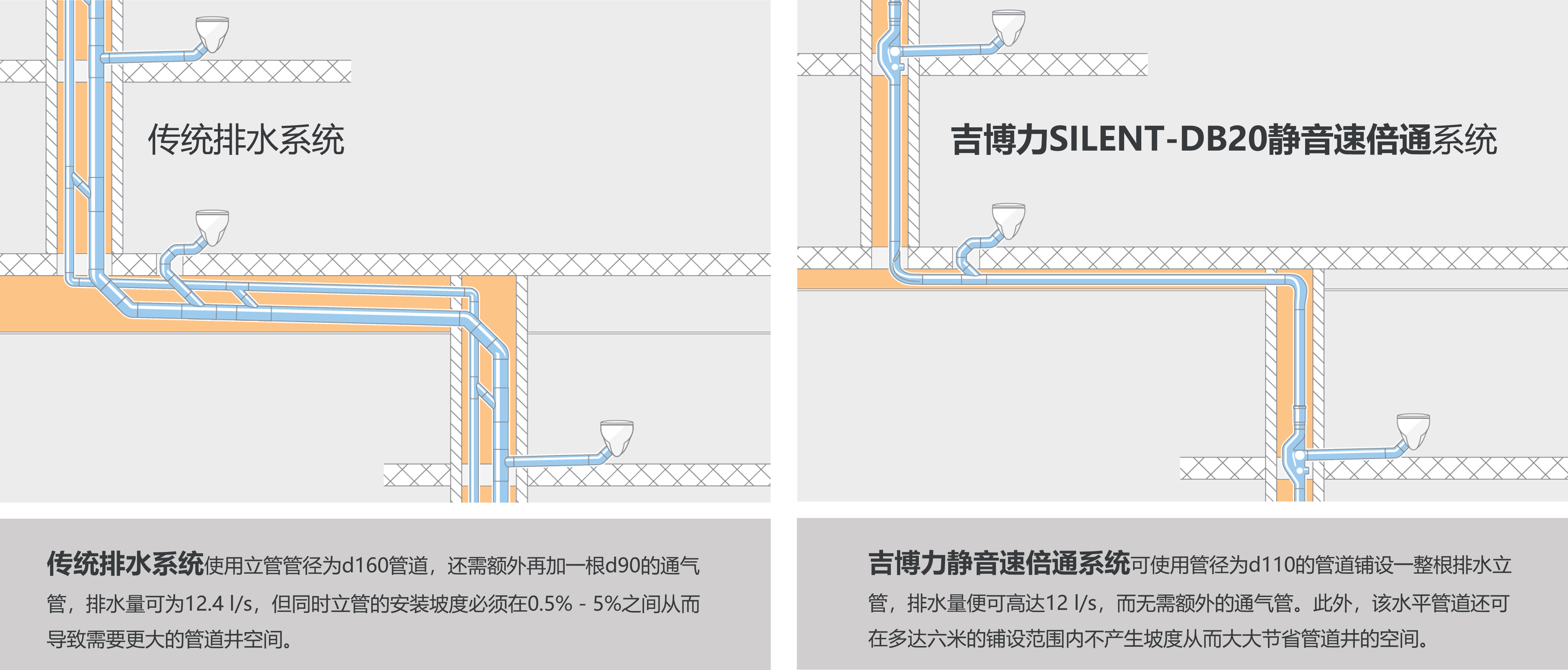 与传统的排水系统相比,吉博力Silent-db20静音速倍通系统可使高速而下的水减缓流速,贴管壁旋转而下。不仅最大限度地降低了排水噪音,还能形成水流中间的空气柱,从而达到水气平衡,实现单立管高效排水。不仅节省了横向和垂直管道井的空间, 更能节省管材、降低建筑总体造价。