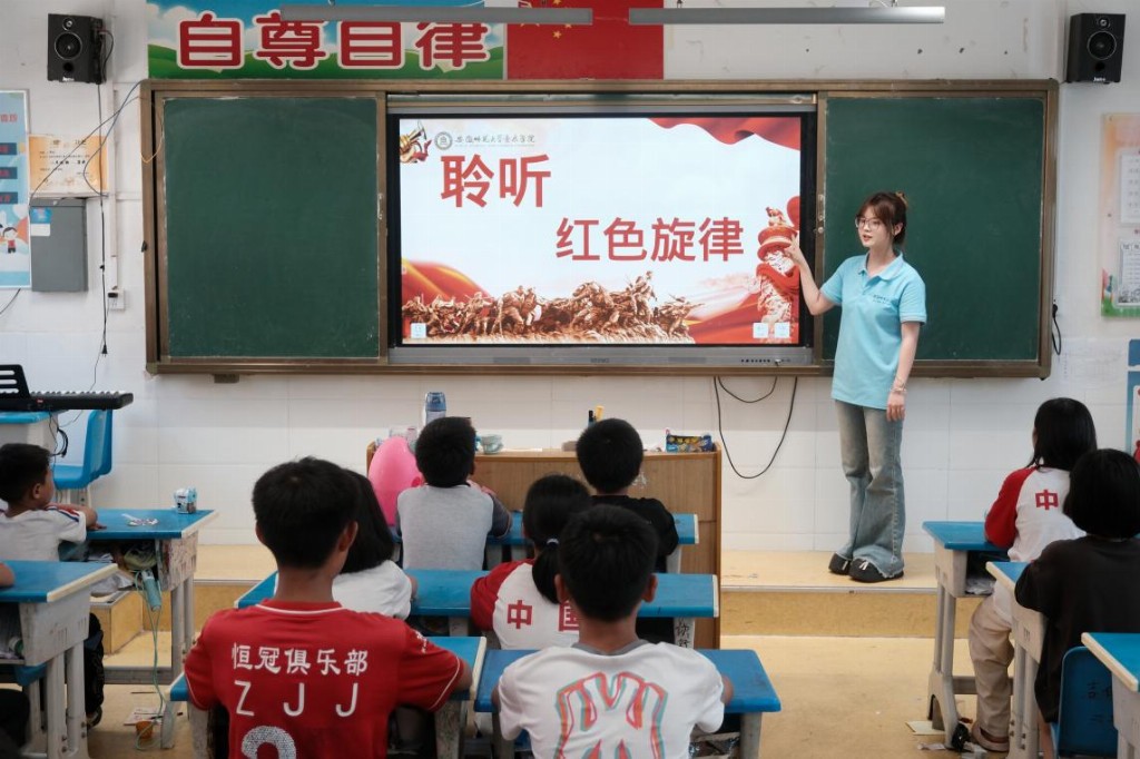 在艺术课程学习之外,支教团队别出心裁,为学生们打造了一堂别具一格的“小椅子课堂”,采用理论宣讲与创新形式相结合的方式,以爱国主题音乐鉴赏为主线,先后教唱了《义勇军进行曲》《我和我的祖国》以及《红星照我去战斗》等经典歌曲。在学唱与讲解的过程中,学生们深刻领略到祖国的伟大,体会到和平生活的来之不易,爱党爱国之情在心底悄然生根发芽,团队期望借此艺术宣讲形式,将红色种子深埋于孩子们心间。