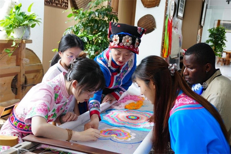 授牌仪式结束后,实践团成员李涵艺表达了她激动的心情:“这一合作既是两校学子践行‘大思政课’要求的生动体现,也是高校与地方协同赋能非遗活态传承的创新尝试。我要继续积极发挥上外学子‘会语言,通国家,精领域’的专业人才培养优势,让羌族刺绣走出大山、走向世界,为讲好中国故事、推动中华文化走向国际贡献青春智慧。”