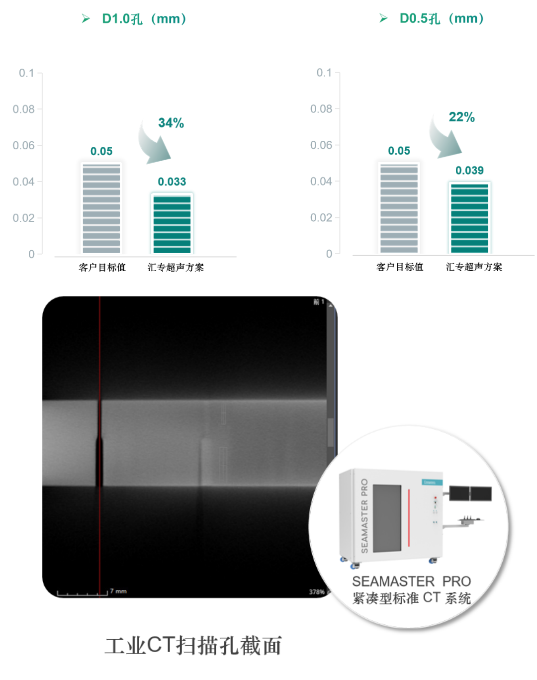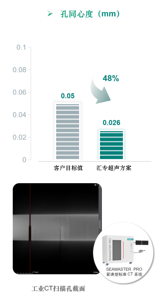 客户目标值≤0.01mm,汇专超声方案加工真圆度均满足要求,D1.0孔真圆度优于目标值37%,D0.5孔真圆度优于目标值59%