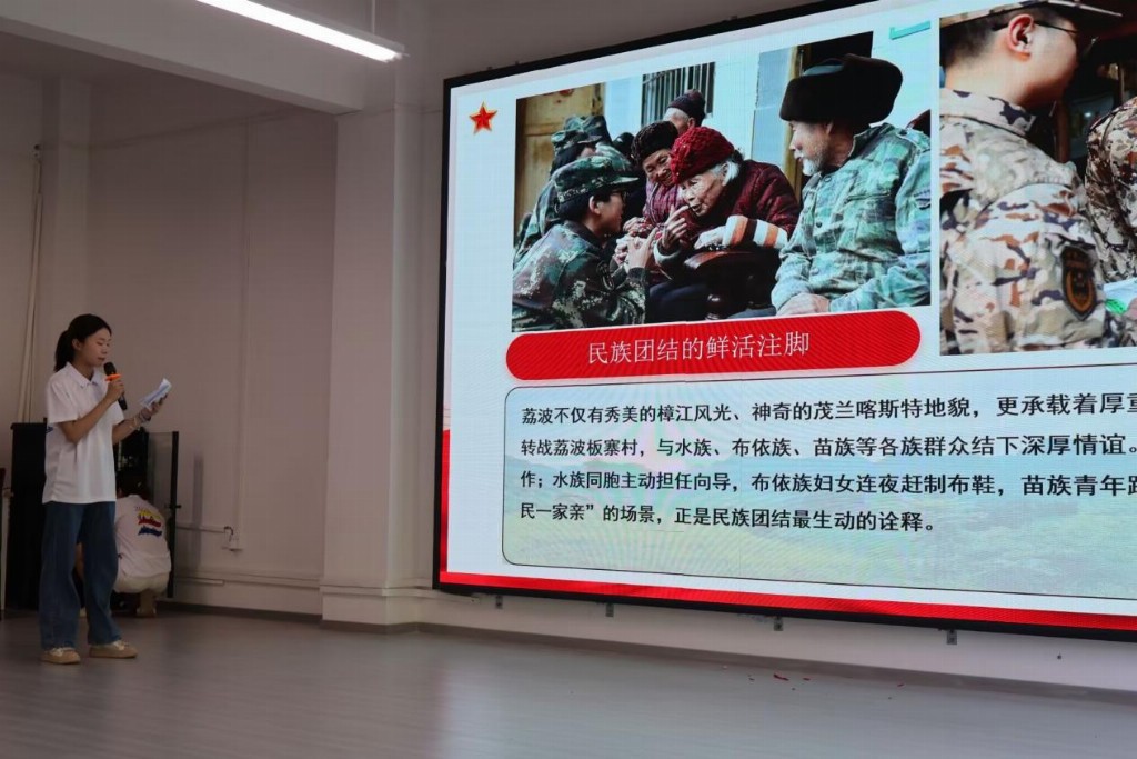 荔波县聚居着布依、水、苗等多个民族,各族群众世代相守、互助共生。实践团深挖本地“民族团结一家亲”的鲜活案例,让民族故事成为铸牢中华民族共同体意识的生动教材。 在“民族团结小课堂”上,志愿者讲述荔波县瑶山乡“汉族医生扎根苗寨20年”“布依族村寨帮苗族乡亲抢收稻谷”等真实故事,用身边人、身边事诠释“团结就是力量”。