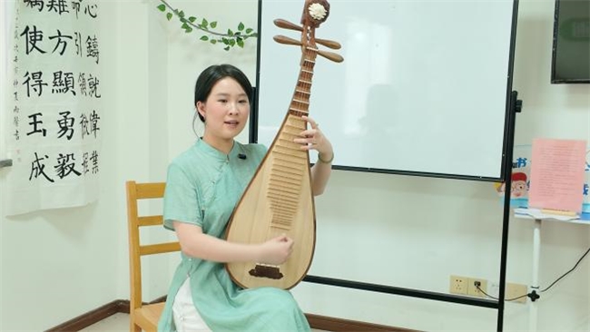 学习评弹不仅是技艺的传承,更是情感与语言的深度交融。从学习吴语特有的发音技巧,到用音韵演绎诗意文字,成员们逐步体会着吴侬软语的温婉细腻。在学唱《枫桥夜泊》时,通过反复的模仿与练习,使得那些流淌在唱词中的文化底蕴渐渐清晰可感。陈一诺耐心指导成员们调整咬字和气息,强调“评弹的韵味在于‘字正腔圆’,每一个音节都要饱满,才能传递出诗词的意境。”