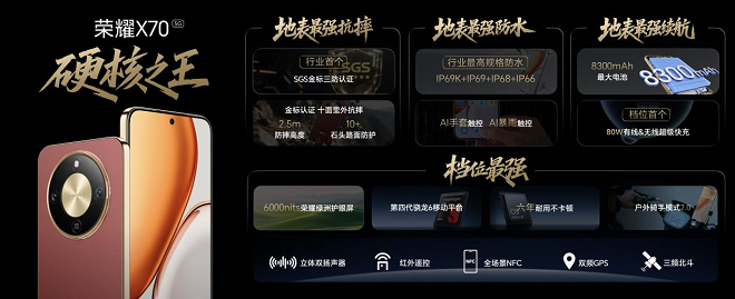 行业首发IP69K工业级防水认证,并集齐IP69K+IP69+IP68+IP66行业最全最高满级防水认证,无论是在6米深水区域,还是85℃高温热水冲刷,荣耀X70都可以稳妥防护,并且支持YOYO助手一句话排尘排水,以及AI暴雨触控和AI手套模式。在雨天、玩水、厨房油污等特殊场景中,都能做到防护无忧,使用自由。