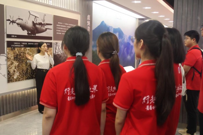 随后,团队参观了英烈山纪念馆。泛黄的飞行日志、残损的军装纽扣等珍贵实物展品,再现了烈士们“矢志强军、血洒长空”的事迹。据解说员介绍,这里每年接待众多祭扫群众,已成为重要的爱国主义教育基地,不断向人们传递着红色精神与力量。团队成员秦芮琪深受感触,展开宣讲。