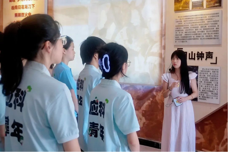 (图为践行团成员倾听讲解员讲述团山寺大惨案)