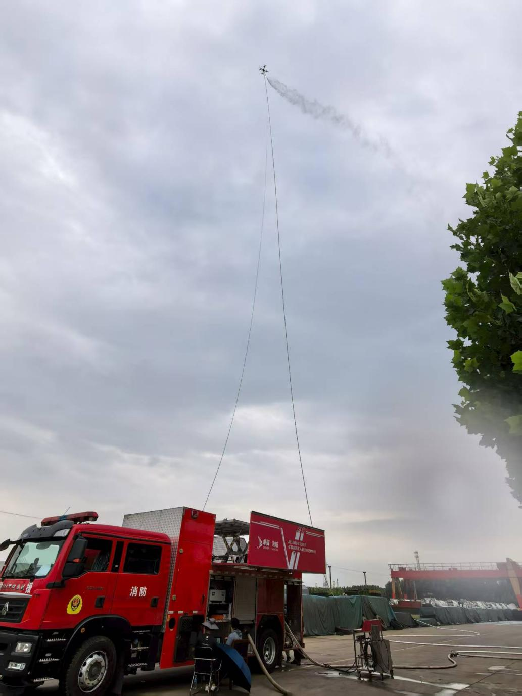 检测现场,ZTX260系留无人机系统以严苛标准通过实飞检验,成功挑战了高层灭火的极限:ZTX260升至150米高度后持续喷射泡沫灭火剂,系留供电总功率稳定控制在50kW以内,动力系统平均油门保持在60%以下,全程姿态平稳运行1小时,成为国内首个完成这一指标的装备。这一成就填补了国内高空连续灭火的技术空白,为超高层建筑消防提供了突破性解决方案。