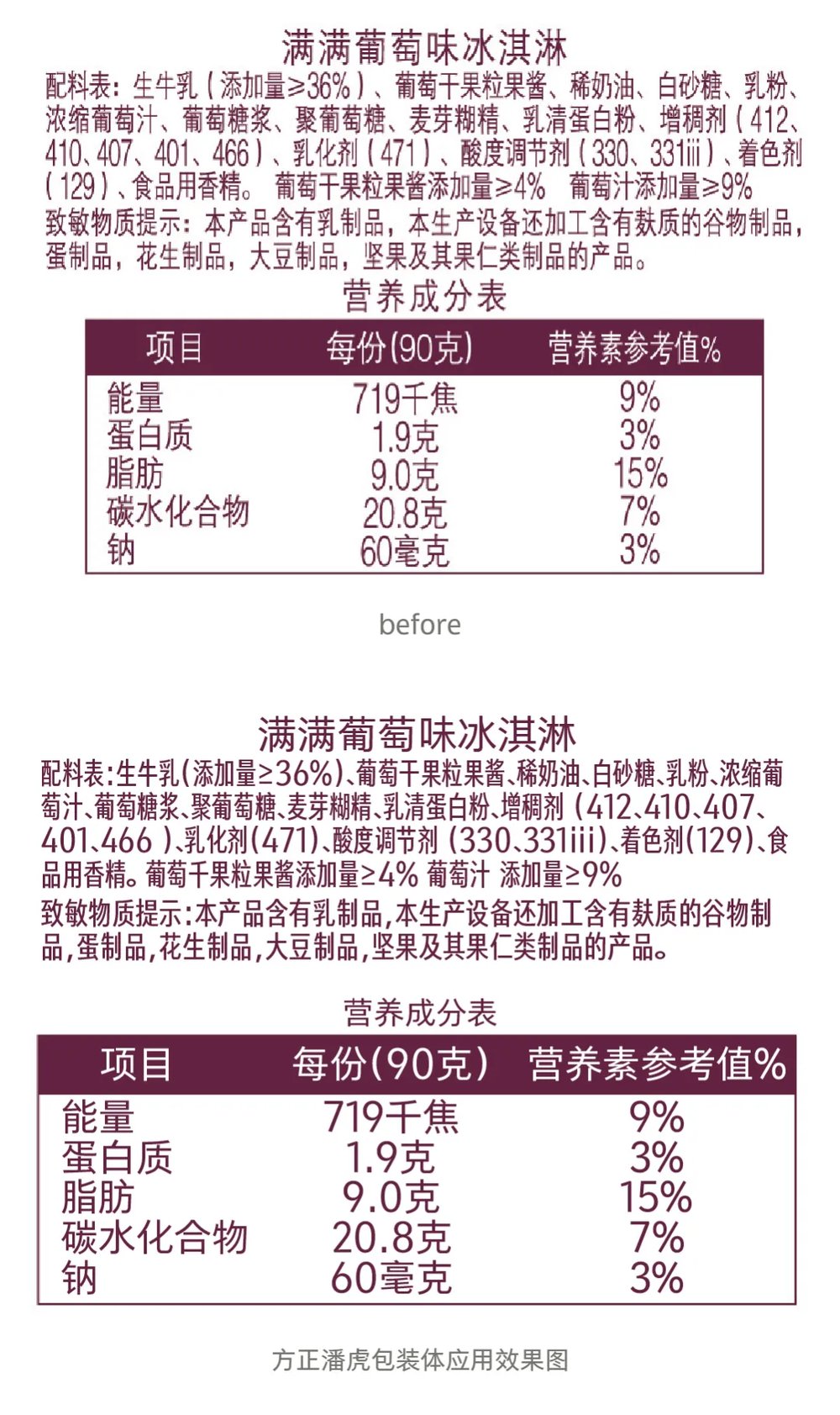 方正潘虎包装体严格遵循国家标准进行合规性设计,其核心创新点在于实现了中西文字符的视觉高度统一,严格匹配国家标准(如GB 7718-2011规定的1.8mm最小字高等关键参数),支持GB18030-2022 L2超大字符集,包含27780个汉字,基本解决配料表、生僻字、地名等信息缺字问题。