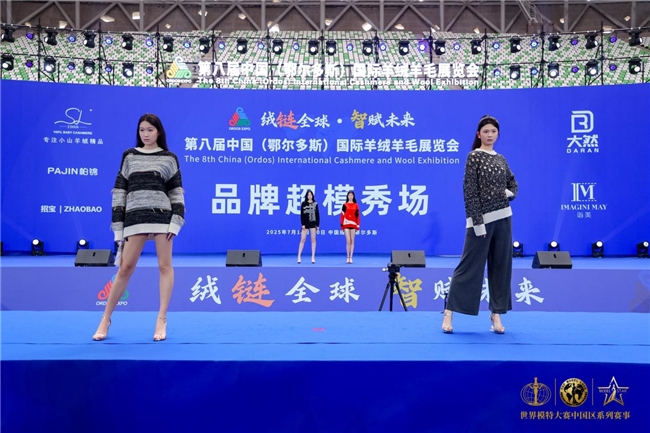 这种“赛事 + 展会”的模式,打破了“模特大赛只谈时尚、产业展会只论产品”的边界。当超模的身影与羊绒展品相遇,当 T 台的灯光照亮羊毛的肌理,观众看到的不仅是一场视觉盛宴,更是羊绒羊毛产业与时尚产业的深度对话—— 模特成为连接“产品”与“审美”的桥梁,让专业的面料特性转化为大众可感知的时尚语言,让鄂尔多斯的羊绒羊毛从 “产业名片” 升级为 “时尚符号”。