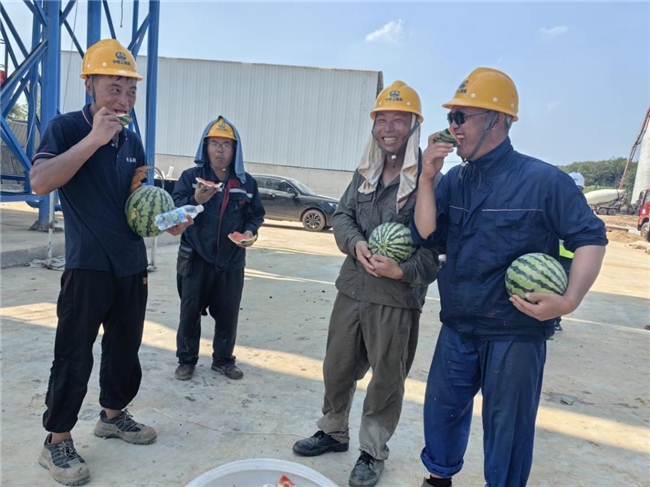 此外,项目领导班子还前往梁场慰问了一线产业工人,送上西瓜等消暑物品,让工人们在炎炎夏日感受到项目部的温暖与关怀。